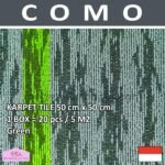 Karpet Tile Como motif garis salur dengan bahan dasar serat 100% Polypropylene. Primary backing terbuat dari non woven lutrador dan secondary backing terbuat dari PVC+fibre glass. Pewarna yang digunakan adalah Solution dyed. Pencucian karpet dapat menggunakan air panas, ekstrasi uap dan sampo.