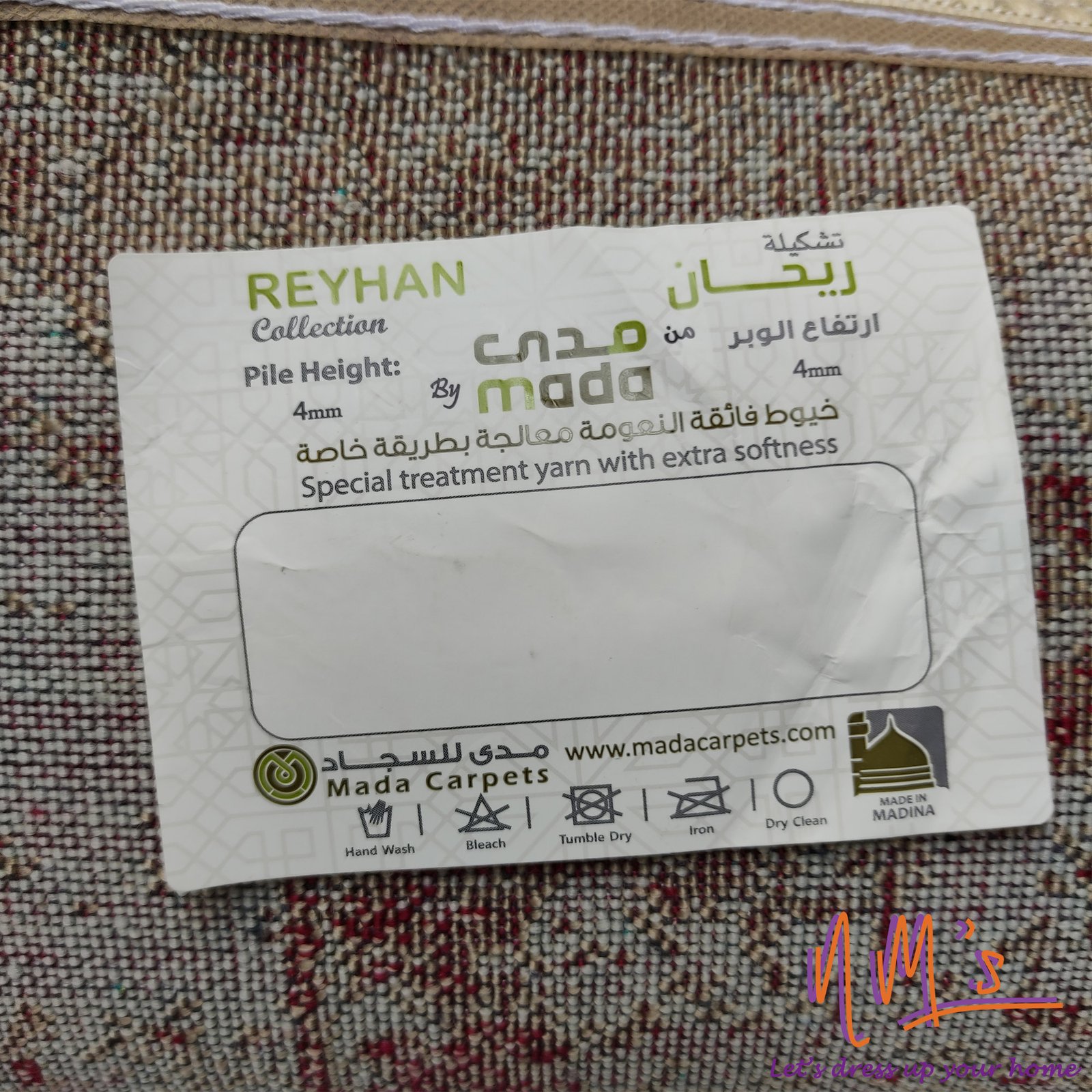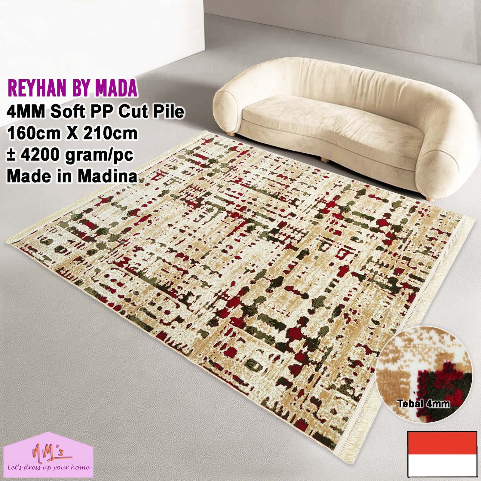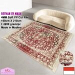 Karpet Reyhan by Mada ukuran 160 cm x 210 cm terbuat dari bahan Soft Polypropylene Pile yang berkualitas sehingga terlihat elegan serta dilengkapi rumbai pada 2 sisi masing-masing 5 cm.Memiliki perpaduan warna dan corak yang indah. Sangat nyaman dipakai untuk alas lantai rumah anda, bisa diletakkan di ruang tamu, ruang keluarga maupun kamar tidur anda. Made in Madinah.
