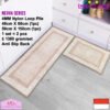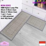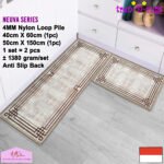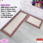 LOOP PILE DAN ANTI SLIP. 100% benang nylon diproses dengan tufting loop pile yang mengubah benang menjadi gelombang-gelombang kecil. Keset dan karpet lorong memiliki tebal 4 mm. Dengan dukungan gel (karet) pada bagian bawah keset dan karpet lorong yang memberikan fitur anti slip sehingga keset dan karpet lorong tidak bergeser-geser.