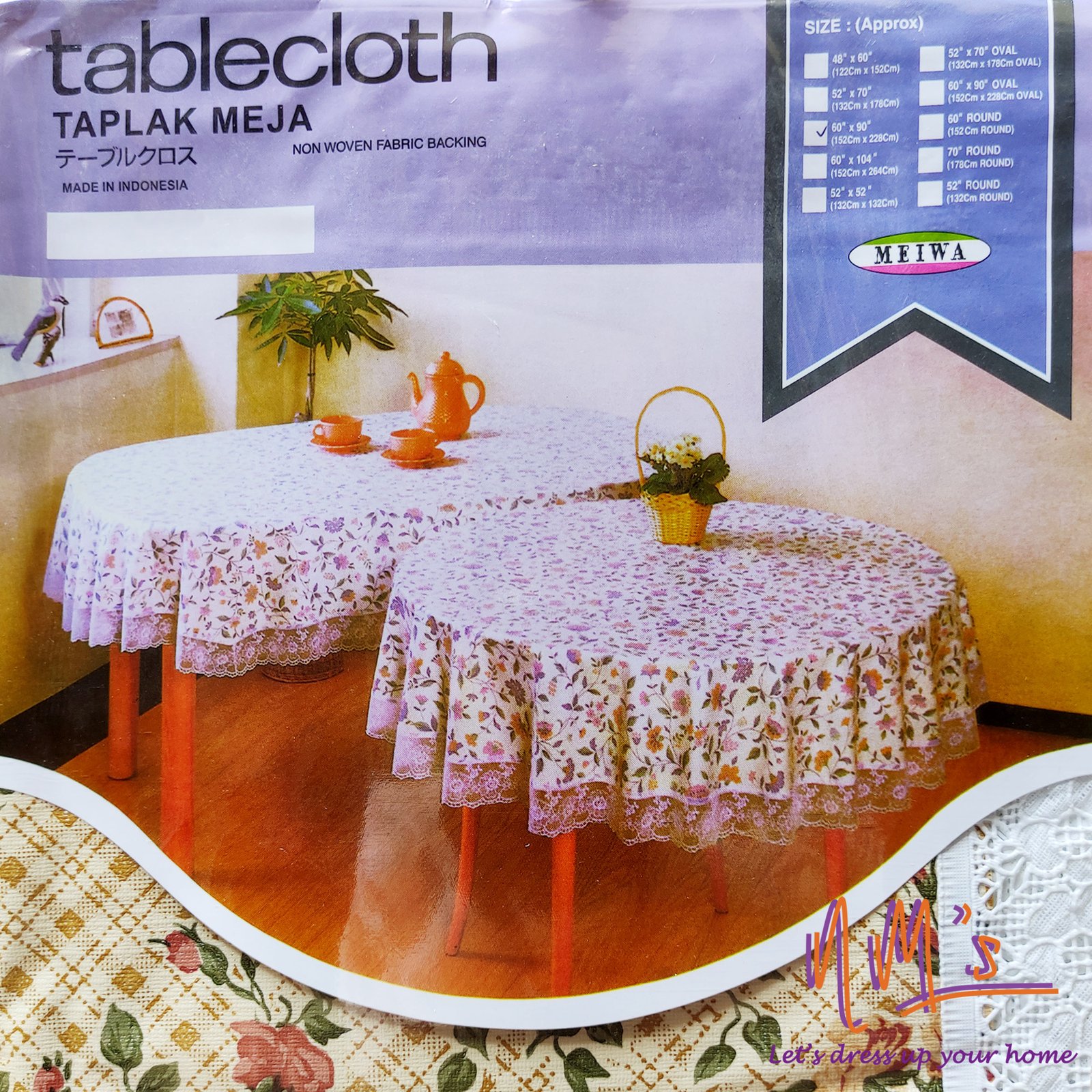 Taplak Meja bahan PVC bentuk persegi panjang transparan dan motif ukuran 60″x90″ atau 152 cm x 228 cm dengan renda putih pada pinggirnya. Dibuat dengan bahan berkualitas bersifat tahan panas maximum 60 derajat celcius (140 derajat F). Cocok untuk meja dengan 4-6 kursi. Dikemas dengan rapi. Jika taplak meja tampak kotor atau lusuh disarankan untuk tidak dicuci, cukup dilap dengan air hangat dan sedikit sabun. Hanya untuk penggunaan di meja saja.